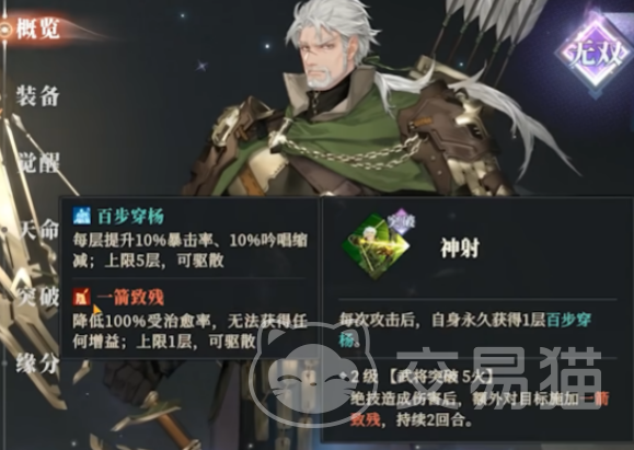 突破技能“神射”则让黄忠每次攻击后都能为自己积累“百步穿杨”效果,最多可以叠加五层,每层提升10%的暴击率和吟唱缩减速度。这样的加成使得黄忠的输出能力不断提升,且技能冷却速度得到有效缩短。在技能的进一步升级中,黄忠还能够对敌方目标施加持续两回合的致残效果,降低目标的治疗效果并封锁增益,使得他在面对敌人时具有较强的控制能力。